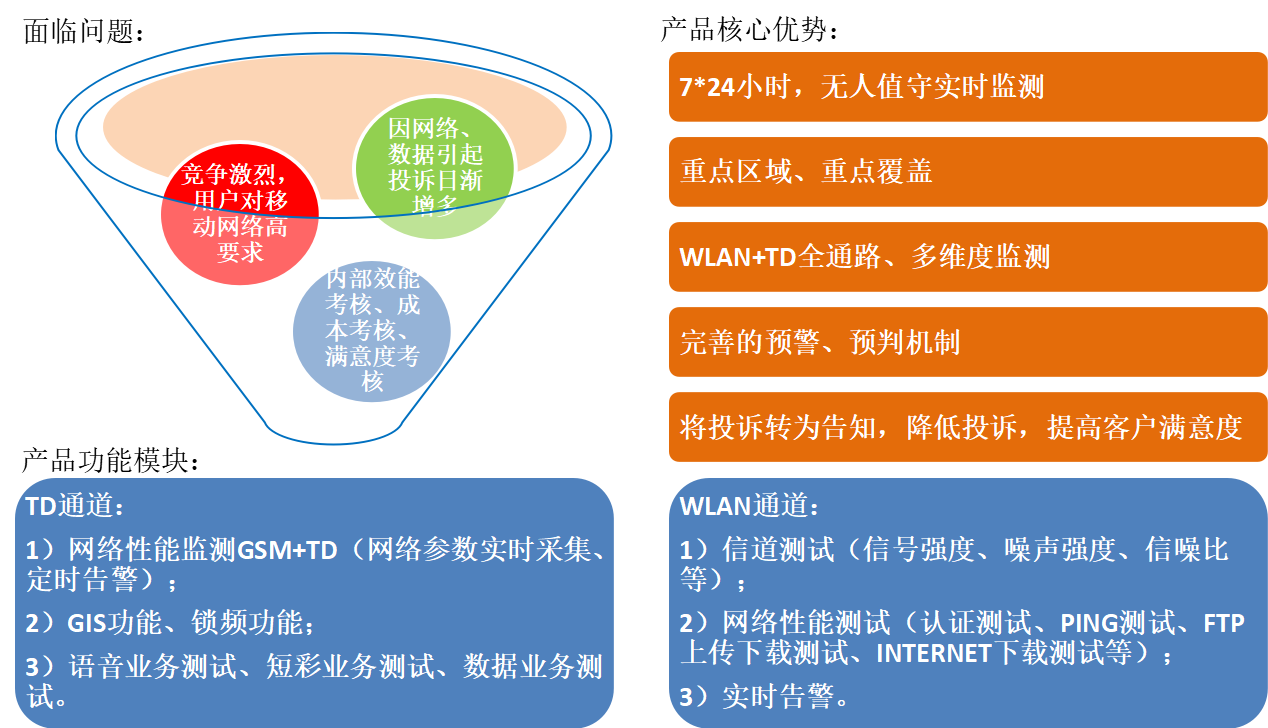 针对2G/3G/4G/WLAN全网络进行实时监测、主动拨测、全天候预警,为运营商在网络监控、信号监测方面提出了更为高标准、高满意度的要求,解决仅有路测RT和人工拨打测试被动方式监控网络畅通