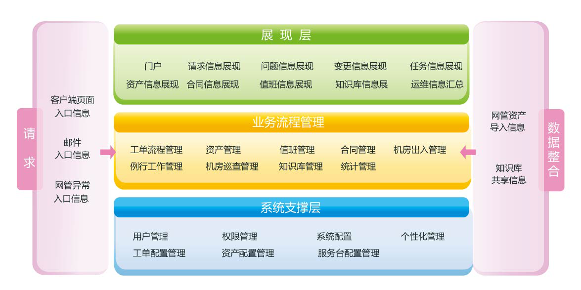 高效的协同工作理念,遵循ITIL标准,节省IT处理时间,支持服务台、请求、问题、变更、任务、资产、知识库及报表管理,便捷的IT运维流程处理模式,简化事件处理流程,从而提高IT运维管理水平。