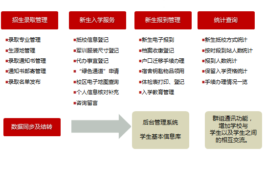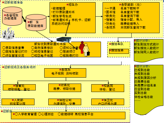 涉及新生入学管理各环节,面向各院系、职能部处以及新生的综合管理信息系统。系统以实现迎新业务中各职能部处间的数据共享和流动,明确各职能部处在迎新过程中的职责和业务管理范围为主要目标,使迎新工作流程更为有序,实现新生入学数据与学校其他相关系统数据的无缝连接,为新生提供方便、高效、“一站式”的入学报到环境和服务