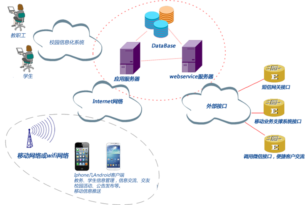 以网络为基础,利用计算机技术、网络技术、通讯技术,实现对学校与教学、科研、管理和生活服务有关的所有信息资源进行全面的数字化;采用传统的网络和规划设计思路,实现多个应用的部署方式,主要运行教务系统、统一身份认证、统一信息门户平台、人力资源管理系统、学工管理系统及协同办公系统等,通过搭建基于windows、linux的云计算平台,制订云计算平台的构建及软件架构要求,实现内部使用的私有云和部分公共云计算平台