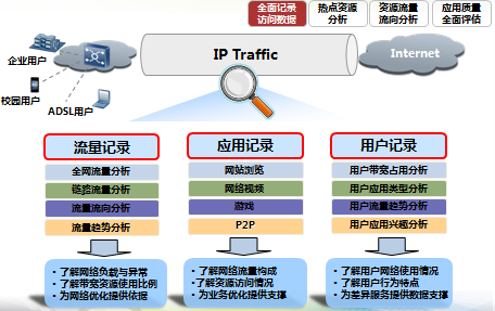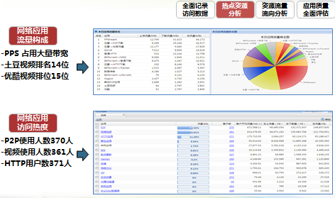 精细管控:应用、带宽、流量有序,业务保障:视频会议、OA、ERP,优化加速:缓存、压缩、优化协议,全网感知:应用、链路、质量,热点资源分析,访问用户分析,指导营销和资源引入,流量流向分析,指导内网资源引入,评估引入效果,网络质量评估,感知关键应用和网站质量,提升客户体验